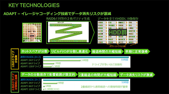 また、製品には「Seagate Secure」による盤石なセキュリティ機能が組み込まれている。ファームウェアには、SFTPと高度な管理者アクセス・コントロール機能の両方を搭載、自己暗号化ドライブが製品を破棄する際にも万全のセキュリティ体制を実現する。「特許取得のSeagate ADAPTデータ保護技術は、従来のRAIDソリューションと比べてリビルド時間を95%と大幅に短縮ができる」と津村主幹技師はメリットを語る。