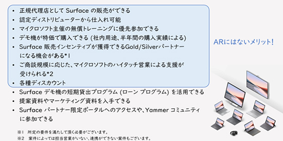 また、DMPになると、マイクロソフトの正規代理店としてSurfaceの販売が可能だ。これは多段商流参加のARにはないメリットだ。Surfaceにはパートナー向けに各種ディスカウントが用意されているが、例えば案件登録でこの他にもARにはないメリットとして、「ADDからの仕入れが可能」「マイクロソフト主催のトレーニングに無料で優先参加できる」「Surface販売インセンティブが獲得できるGold/Silverプログラムに参加が可能」「商談規模に応じたマイクロソフトのハイタッチ営業による支援が受けられる」「各種ディスカウント」といった特典が提供される。