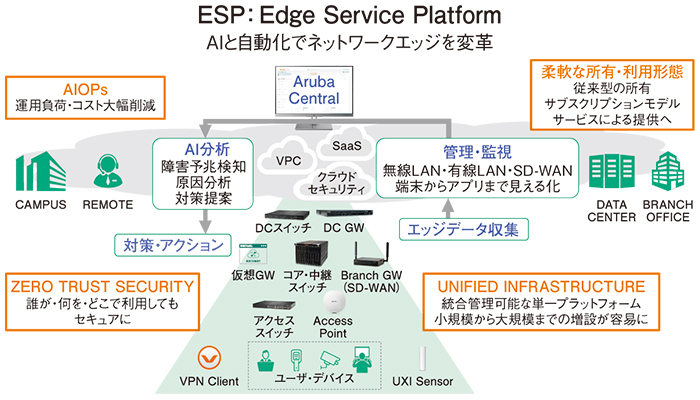 2020年には、そのためのプラットフォームとなるAruba Edge Services Platform(ESP)が登場。「このプラットフォームは『AIOps』『ゼロトラストセキュリティ』『ユニファイドインフラストラクチャー』の三つの特徴を備えており、企業はサブスクリプションのような柔軟な形態でAruba製品を所有または利用できるようになる」と天野氏は解説する。