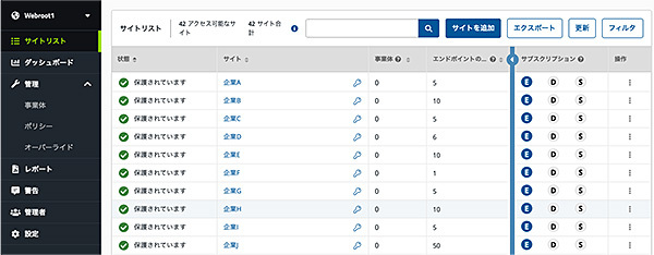エンドポイントプロテクションが標準で備えるBusiness Management Consoleは、複数のサイト(企業)を一つのコンソールで管理することが可能なマルチテナント対応になっている。