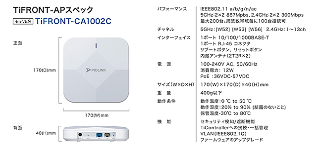 TiFRONT-APのスペックは必要十分だ。SMBやサテライトオフィスから、フロアAPとしての活用も可能だ。1台のAPで最大100台の端末を収容でき、温度仕様が50度までと、工場をはじめとする場所での活用も想定している。価格も法人向けの無線APと遜色ない価格帯で、その上にセキュリティ機能が追加されている。販売店としても“利益が取りやすい”製品といえる。