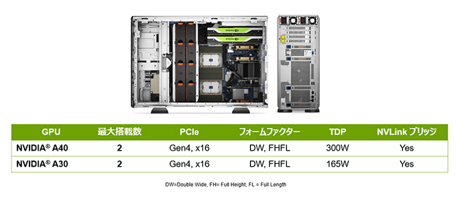 まず、2ソケット(デュアルCPU)モデルの「PowerEdge T550」は、第3世代インテル Xeon スケーラブル・プロセッサー(Ice Lake)搭載の新世代PowerEdge サーバー唯一のタワー型。注目点は、NVIDIA GPUをサポートしたことで、NVIDIA A40やA30を最大2GPU搭載できる。