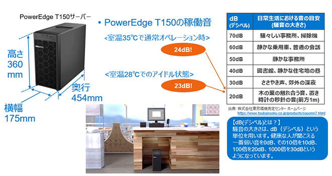 PowerEdge T150は、ファイルサーバーやテスト・開発用のサーバー、また流通店舗のPOSコントローラー、診療所での店舗管理サーバーなど、組込サーバー用途にも適している。T150の大きな特長はその静音性だ。 室温35℃の通常オペレーション時でも24dB(デシベル)で、これは、日常生活における音の目安として、木の葉の触れ合う音が20dB(デシベル)、ささやき声が30dB(デシベル)であることを加味すると、オフィスに設置してもほとんど気にならない稼働音といえ、部門のメンバーからサーバーの騒音についてクレームが入ることもないだろう。