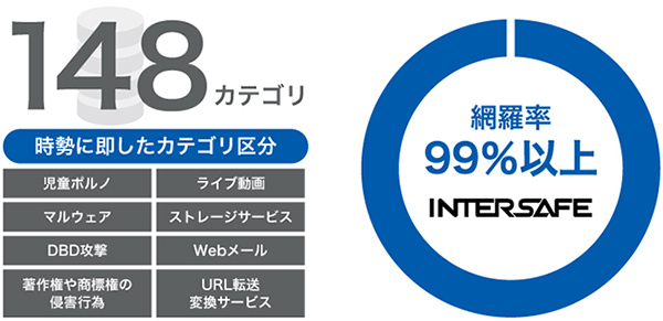 同社は、オンプレミス型の「InterSafe WebFilter」やクラウド型の「IntereSafe GatewayConnection」など、ユーザーの利用形態にあわせて複数のWebフィルタリングソリューションを提供している。共通する機能面の強みは、国内最高水準のフィルタリング精度にある。URLデータベースは業界最大級の148カテゴリ、登録コンテンツ50億以上を有し、Webアクセス網羅率99%以上を実現している。これにより、Webアクセス時の脅威を極小化するとともに、きめ細かな制御・管理が可能となる。なお、ALSIのURLデータベースは、国内大手携帯キャリアをはじめ、1500万端末以上に導入実績がある。Yahoo!きっずの画像検索機能にもALSIのフィルタリングサービスが採用されている。最新のWeb脅威に対応するため、Webフィルタリング製品として必要・十分な機能は全て標準機能で提供していることも、ユーザー満足度につながっている。そして、契約期間中は無償でバージョンアップができるため、余計なコストや追加投資が不要だ。