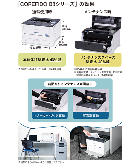 「プリンタの設置・運用スペースを削減するOKIの独自技術であるスペースセービングテクノロジーを採用した第2弾の製品であり、日常の運用で必要なメンテナンススペースは従来機種比で49%削減と半減している(※A4使用時。B842dnの場合は42%減)。これによりデスク上だけではなく、カウンター周りやラック内、デスク下など設置場所の選択の幅が広がる」と井上事業部長。