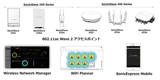 ソニックウォール・ジャパンでは、セキュアで快適なWi-Fi環境を実現したいと望む中堅・中小企業に向けて、多様なワイヤレスアクセスポイント「SonicWave」、クラウドホスト型管理コンソール「Wireless Network Manager」、管理用モバイルアプリ、導入・運用をスムーズにする「WiFi Planner」をラインアップし、Wi-Fi導入プロジェクトの計画から、運用管理までのステップをトータルサポートする。