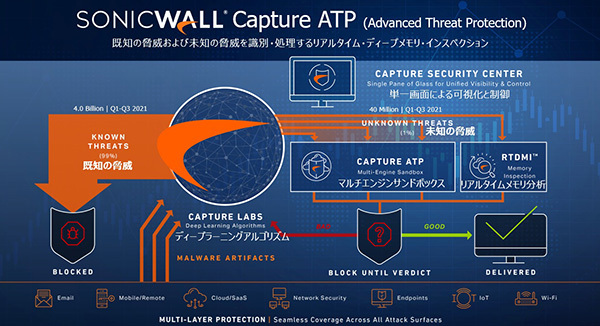 そしてSonicWaveの一番の強みがセキュリティ機能で、その核になるのがリアルタイムの保護を実現する「SonicWall Capture Advanced Threat Protection(ATP)」だ。全世界で運用されている110万台のSonicWallセキュリティデバイスから上がってくる脅威情報を分析し共有するエコシステムである。