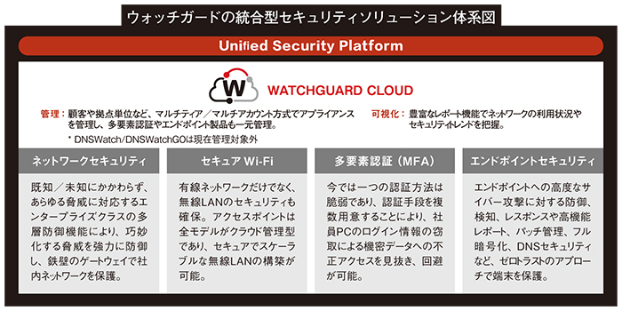 UTM/NGFWの「WatchGuard Firebox」で知られるウォッチガード・テクノロジー・ジャパンが提供する、総合的なセキュリティプラットフォーム「WatchGuard Unified Security Platform(USP)」。管理クラウド「WatchGuard Cloud」が用意されているので、中堅・中小企業でも管理は容易だ。MSP(マネージドサービスプロバイダー)はこのWatchGuard Cloudをマルチテナント管理や月額サブスクリプション方式のための管理ツールとして活用できる。