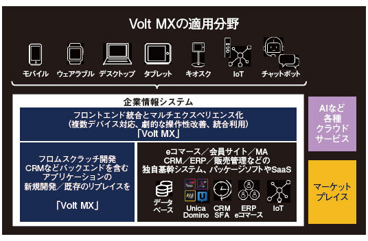 Volt MXプラットフォームは、ID管理、統合、オーケストレーション、ビジネスプロセスの自動化、およびルール管理のための堅牢なサービスを備えており、クラウド基盤として提供される。iOS/Android/Windowsといった異なるデバイスで動作するアプリを効率的に開発することができる。
