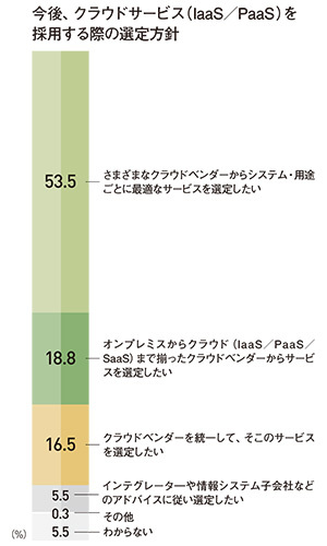 調査では、現在導入しているクラウドサービスについて、Amazon Web Services(AWS)、Microsoft Azure、Google Cloud、Oracle Cloud Infrastructure(OCI)を主に取り上げ、今後導入する際の選定方針や重視点などについてたずねた。まず、主要クラウドサービスの重複利用は多く、全体の65.0%に及んだ。主要4サービス間でも複数を並行して使っている例が多いことが分かった。管理の容易さから、一つのクラウドベンダーに絞って利用することを良しとする考え方もある。しかし、クラウドサービスにはそれぞれ特徴がある。上記に挙げた主要4ベンダーに限っても、ある程度の得手不得手がある。用途と目的に応じたサービスを適材適所で活用すれば、より早くビジネスゴールに近づけるという利点もある。実際、今回のアンケートで「今後、クラウドサービス(IaaS/PaaS)を採用する際の選定方針」を聞いた設問でも、「さまざまなクラウドベンダーからシステム・用途ごとに最適なサービスを選定したい」が最多で53.5%を占めた。マルチクラウドを駆使したシステム運用が主流になっていきそうだ。