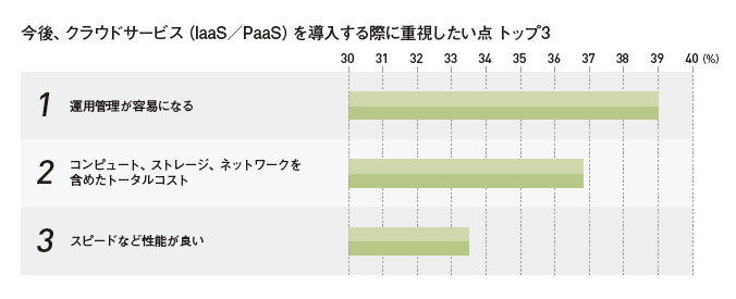 一方で「今後、クラウドサービス(IaaS/PaaS)を導入する際に重視したい点」をたずねたところ、「運用管理が容易になる」が39.0%と最多だった。複数サービスのいいとこどりをしつつも、運用管理は容易にしたいという、一見相反する要望だ。しかし、現場としてはこれが正直な要望だろう。その他の重視点では「コンピュート、ストレージ、ネットワークを含めたトータルコスト」が36.8%、「スピードなど性能が良い」が33.5%とこれら3点が3割を超え上位を占めた。簡単で安く速いという特性が、クラウドサービスには求められている。