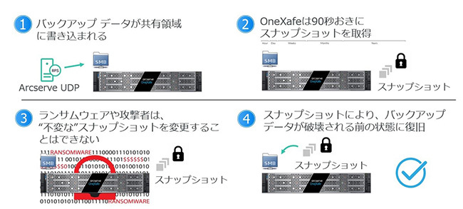 Arcserve OneXafe 4500シリーズは、SMB/NFS 共有を提供するバックアップ専用NASだ。一番の特徴は、イミュータブル(不変)であること。ランサムウェアによるバックアップデータの改変を防止するため、バックグラウンドで定期的に変更不可能なスナップショットを取得する。そのスナップショットを使用することで、ランサムウェア攻撃や不正アクセスによりデータに改ざんや削除があっても、バックアップデータが破壊される前の状態に復旧することができるようになっている。