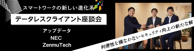 テレワークの普及が進む一方、ランサムウェアの脅威が増している中で、データを個々のPCに残さない環境を求める企業が増えている。これまでのVDIやシンクライアントに加えて、低コストで優れた使い勝手を提供する新たな選択肢として大きな注目を集めているソリューションがスマートワークの新しい進化系「データレスクライアント」だ。今回、アップデータの小川敦代表取締役社長とNECの小方秀介・パートナーソリューション統括部長、ZenmuTechの阿部 泰久・取締役CMO(兼)営業推進部部長にデータレスクライアントが求められる背景、ビジネスの状況、パートナー施策などを聞いた。