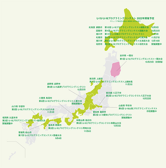 ITジュニア育成交流協会が強力にバックアップして全国に展開している「U-15/U-16プログラミングコンテスト」。今年も徐々に日程が決まり始めました。開催日が確定しているのが13カ所、日程調整中が1カ所、開催調整中が4カ所。1都、1道、11県で計18大会が開催される見込みです。あいにく新型コロナウイルス感染症の第7波が全国を襲っている真っ最中。事前講習会の開催などで苦労されている地域もあるようです。しかし、困難を乗り越え、秋からの冬にかけての大会は無事開催できることでしょう。2022年の目玉は岩手・一関大会。一関工業高等専門学校の千田栄幸先生にご尽力いただき、第1回大会が実現しそうです。まずは作品部門からのスタート。ぜひ、ご注目ください。