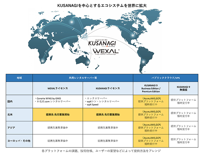 第1弾となったのは、エックスサーバーとの技術提携である。この提携に基づき、エックスサーバーはレンタルサーバー「エックスサーバー」の全プランと同じくレンタルサーバーの「wpXシン・レンタルサーバー」の全プランに、KUSANAGIの技術を適用して処理速度の向上を実現。WordPress専用クラウド型レンタルサーバー「wpX Speed」の全プランにもKUSANAGIの技術を取り入れた。