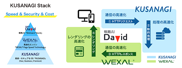 この3エディションのうち、最上位のPremium Editionは同社の高速化エンジン「WEXAL Page Speed Technology(WEXAL)」と戦略AI「Onimaru David(David)」をKUSANAGIとセットにしたソリューション「KUSANAGI Stack」として提供される。WEXALが担当するのは、HTTPサーバーから送られてくるソースコード(HTML/CSS/スクリプト)と画像を圧縮して、Webブラウザーでのレンダリング(表示)速度を高める役割。その圧縮とレンダリングをどのように行うかをリアルタイムで決めるのが、Davidの役割だ。