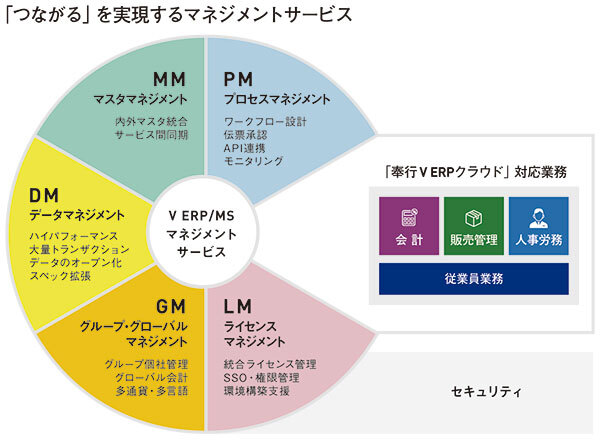 最大の特徴は、2023年4月より順次提供を開始する「つながる」ための新しいアプローチ、「マネジメントサービス」(図参照)だ。マネジメントサービスとは、ワークフローなど業務プロセスをコントロールする「PM:プロセスマネジメント」、他サービスを含むマスタ統合を実現する「MM:マスタマネジメント」、大容量データをハイパフォーマンスで処理し自由なデータ活用を実現する「DM:データマネジメント」、グループ企業独自の業務や多通貨・多言語による処理をコントロールする「GM:グループ・グローバルマネジメント」、ライセンスや権限管理に加え、シングルサインオンの利便性を提供する「LM:ライセンスマネジメント」の五つから成る奉行V ERPクラウド独自のサービスである。PM:プロセスマネジメント、MM:マスタマネジメントが提供されることで、例えば、発注管理システムとAPI経由で発注申請データのやり取りを行ったり、顧客管理システムの得意先情報を奉行V ERPクラウドで整理して発注管理システムに同期したりすることも可能になる。従来、パートナーが工数を割いていたデータ連携を効率化でき、パートナーの連携ビジネスにも貢献できる。連携可能なサービスは、会計61、販売管理55、人事労務209種類となっており、オンプレミスやクラウドといったシステム環境を問わず、多様なサービスとつなぐことができる。