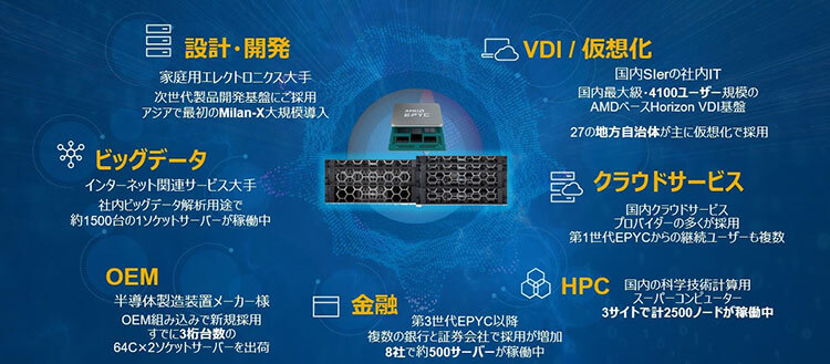 「特に顕著なのはユーザー層の拡大で、第2世代EPYC(Rome)の頃は、HPCとサービスプロバイダーが多くを占めていたのに対して、第3世代EPYC(Milan)になり、この1年で地方自治体のVDI基盤、メーカーの統合開発基盤、仮想化環境、証券会社や銀行などの金融分野での採用、半導体製造装置でのOEM組み込み用など、多様な業種・ユーザー層での採用が進んでいる。最近ではパートナーの方々の頑張りで、地方でもかなりAMDサーバーの採用が浸透してきた」と岡野氏。