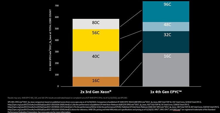 EPYC 9004シリーズは、デスクトップPC向けCPU「Ryzen 7000」シリーズと同様に、製造プロセス5nmの最新アーキテクチャ「Zen 4」マイクロアーキテクチャのCPUコアを採用。CPUダイ「CCD」の数を第3世代EPYCの8個から最大12個に拡大した。CCD一つ当たり8CPUコアを内蔵しているため、第3世代EPYCのコア数64(8コア×8)に対して、1.5倍となる96コア(8コア×12)を1パッケージで実現。インテルの現行製品である第3世代Xeon SPの40コアとの比較で2倍以上のCPUコアを1ソケットで実現している。なお、IPC(1クロック当たりの実行可能な命令数)は第3世代EPYCから14%向上しているという。