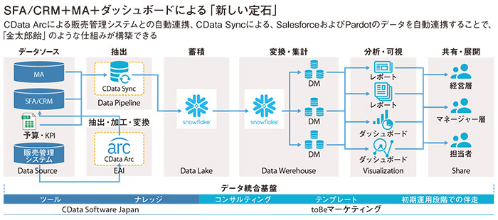 ――日本企業のそのような課題を解決するためのソリューションを、CData Software JapanとtoBeマーケティングが共同で準備されていると聞いています。中嶋 CDataでは、CData Syncというデータパイプラインを提供しています。このツールを使えば、Salesforce やAccount Engagement(旧Pardot)をはじめとした400種類以上のSaaSからデータ分析基盤であるDWHにデータをノーコードで収集できます。さらに、両社でCData Syncによるデータ統合だけでなく、マーケティングから営業の主要な定石ダッシュボードを提供します。個々の企業には特殊性はあってもBtoBの活動ではマーケティング・営業で最大公約数となるデータ活用は存在します。