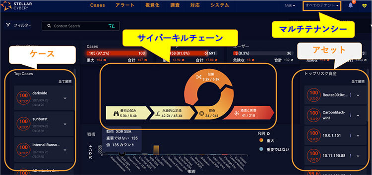 具体的な製品のGUIでは、ダッシュボード中央にてサイバーキルチェーンを可視化し、段階ごとの攻撃や、その中で対応すべきものの数など、全体像を直感的に把握できる。また画面右上でテナントを簡単に切り替え可能だ。
