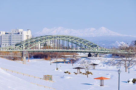 旭山連峰と石狩川を背景にした風光明媚な場所に架かっている。
