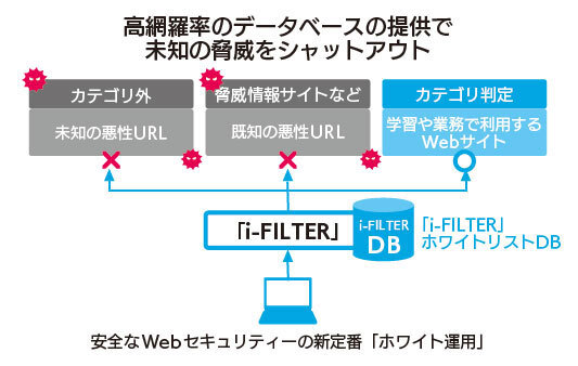 i-FILTERの最大の特徴は「ホワイト運用」だ。i-FILTERはブロック対象としてデータベースに登録済みのサイトはもちろん、未知のサイトもいったんはブロックし、デジタルアーツが安全性を確認したうえでデータベースへ登録している。そのためユーザーは安全なサイトしかアクセスできない。