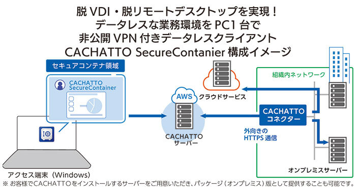 新良(e-Janネットワークス) 私たちはデータ保護とVPN機能を組み合わせたデータレスクライアントの「CACHATTO SecureContainer(カチャット セキュアコンテナ)」を提供しています。VDI、DaaS、リモートデスクトップなどの「次世代」に相当するソリューションであり、それら従来の技術の上位互換と考えています。コロナ禍でPCを使ったテレワークを余儀なくされ、その環境整備を進めた際、私たちもVDI、DaaS、リモートデスクトップそれぞれに一長一短があると分かり、次世代のサービスが欠かせないと考えました。そして試行錯誤した結果、データレスクライアントという解にたどり着きました。