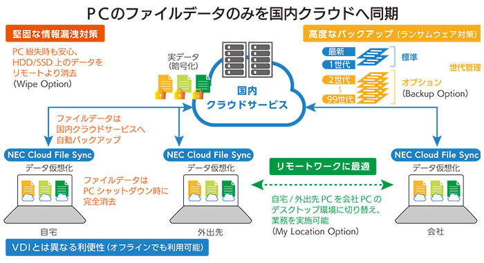 小方(NEC) 国内クラウドを基盤とするデータレスクライアントソリューション「NEC Cloud File Sync」を提供しています。これは私の独自の定義ですが、Fat PCを第1世代、VDIなどのシンクライアントを第2世代と捉えると、その次の第3世代のデスクトップのかたちがデータレスクライアントであると考えています。なぜこれが出てきたかと言えば、一つはセキュリティーに強いこと。もう一つがコストで、VDIは導入コストが高く運用も難しいため、中小企業には向きません。データレスクライアントはその解決策になるので、引き合いが増えています。コロナ禍以降もリモートワークは続いていますが、PCの持ち出しにはリスクが伴います。その対応としてのニーズが高まっていると感じます。