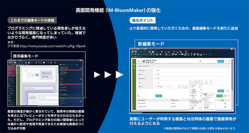 今回のアップデートの目玉は、画面開発で使う「IM-BloomMaker」の機能強化だ。これまでの画面編集モードはプログラミングに精通した熟練エンジニアでないと扱いにくかったが、2024 Springからは直感的に扱える画面編集モードが追加になった。この改善により幅広いメンバーが画面編集に関与できるようになる。よりモダンで洗練された画面を開発できるようになるため、エンドユーザーのUX向上も期待できるだろう。これに伴い、すでに開発済みの画面を移行する方法も提供している。