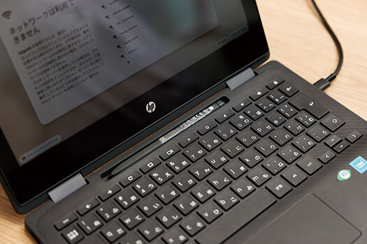 どれだけデジタル化が進んだとしても、自らの手で「書く」体験は教育において非常に重要だ。それを踏まえてGIGAスクール構想 第2期からは、従来からのタッチやキーボードに加え、タッチペンも文部科学省の標準仕様に追加となった。日本HPとしてもペンには力を入れており、純正品であれば画面に手がついてしまってもペン先だけを感知してくれる「パームリジェクション機能」に対応している。また圧力感度は4096段階に分かれており、細かい筆圧の変化を感知できるため、漢字を書いたり筆算を行ったり、図を描画したりする際も有効だ。ペン先の反対側には消しゴム機能もついているため、今後増えてくると予想される手書き教材やテストを行う際に時間を失わずに済む。ペンの活用を促進するにあたり、最大の課題は紛失だ。保護者に紛失したペンの再購入を求めるのは難しく、自治体側で予算を計上して購入しなければならない。しかし、純正品のペンは値段が高く、できる限り紛失は避けたいところだ。一般的な製品の場合、ペンの収納は端末の側面に差し込むスロットイン方式や本体横部分にマグネットで脱着するタイプが多く、これだと移動中に紛失するリスクが高い。そこで日本HPでは、キーボードの上部に充電機能付きペン収納トレーを設けた。スロットイン方式よりもペンの有無が目立つため、仮に紛失しても気づきやすい。そしてキーボードの上部なら、PCを閉じてしまえばペンが落ちることはなく、登下校や教室移動時の紛失を防げる。トレーはペン先をどちらの向きにしても充電可能で、充電中と満充電でランプの色を変えるなど分かりやすい見た目になっている。1回の充電で最大約20日間使用可能だ。