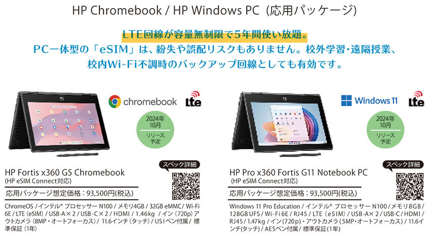 そこで日本HPでは、LTE回線を容量無制限で5年間利用できる端末を発表した。PCと一体型のeSIMを搭載しているため、SIMの紛失や誤配リスクはない。LTE対応であれば校内のWi-Fi環境を補完でき、さらに校外学習や自宅へ持ち帰った際も使える。5年分のLTE回線利用料は上乗せされるものの、校内ネットワーク環境の整備費用と比べれば安上がりになるケースは多い。