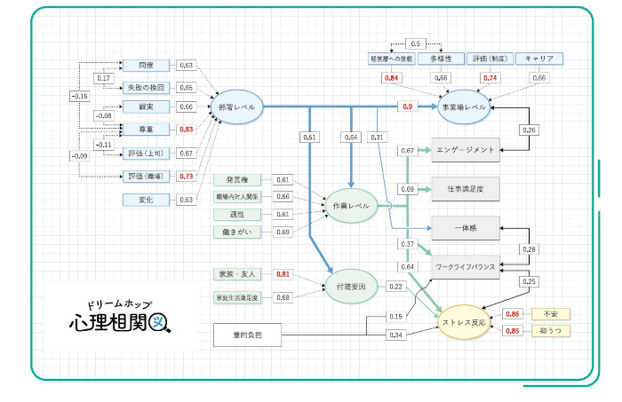 社員のストレスチェックを実施したものの、その結果を役立てられていないケースも多い。「ドリームホップ心理相関図」では、ストレスの原因と結果の相関関係・因果関係を明らかにして、影響力を可視化することで解決すべきストレス原因の優先順位を明確化。従業員の幸福度向上を通じて、Well-Being経営に貢献することができるものだ。