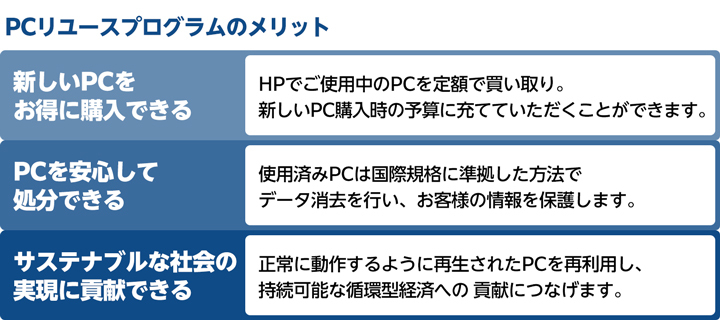また、HPは、サステナブルな循環型経済へ貢献する「PCリユースプログラム」も提供している。法人ユーザーが新たにHPのビジネスPCを購入する際、現在使用しているWindows PCやChromebookを定額で買い取るというもの。古いPCを廃棄せずにリユースすることで、環境負荷を低減し、サステナブルな活動を促進することが目的だ。本プログラムで回収したPCは、DoD 5220.22-MおよびNIST 800-88 Clear・Purgeに準拠した方法でデータ消去を実施、リファービッシュ(再生)した上で、再利用している。