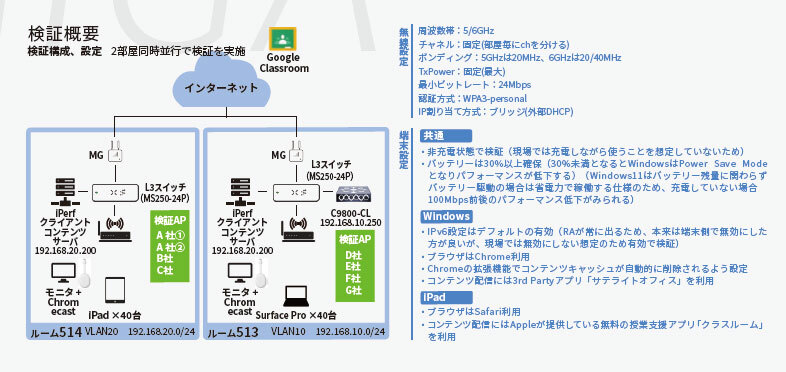 同社では、主要7社の8製品を対象にマルチベンダーワイヤレス検証を実施。実際の学習環境を再現すべく、1クラスに相当する40台のタブレットを同時接続して性能を測定した。
