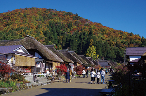 かやぶき屋根の民家が30軒以上並び、国指定重要的建造物群保護地区に指定されている。