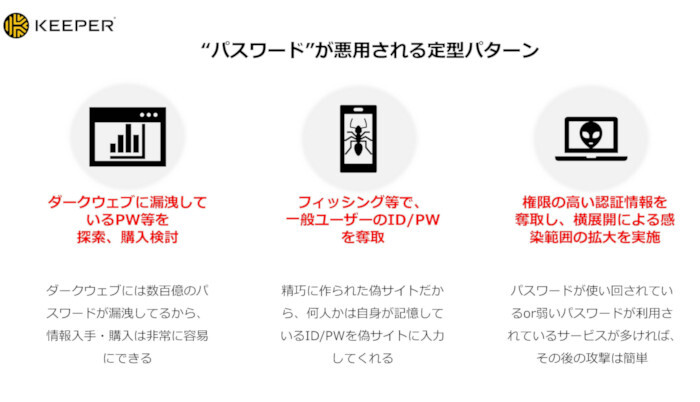 サイバーセキュリティ対策のなかでユーザーが直接関与するのが、各種システムにログインするためのパスワードだ。パスワードに関する課題としてKeeper Security、 APAC Lead of Salesの田辺洋介氏は「狙われている」と「無駄な時間」を挙げる。前者は、パスワードがあれば各種システムに侵入できるため、さまざまな形で攻撃者から狙われてしまっているのだ。「サイバー攻撃の68%はパスワードに起因し、特にランサムウェア攻撃にその傾向が見られる」と田辺氏は語る。