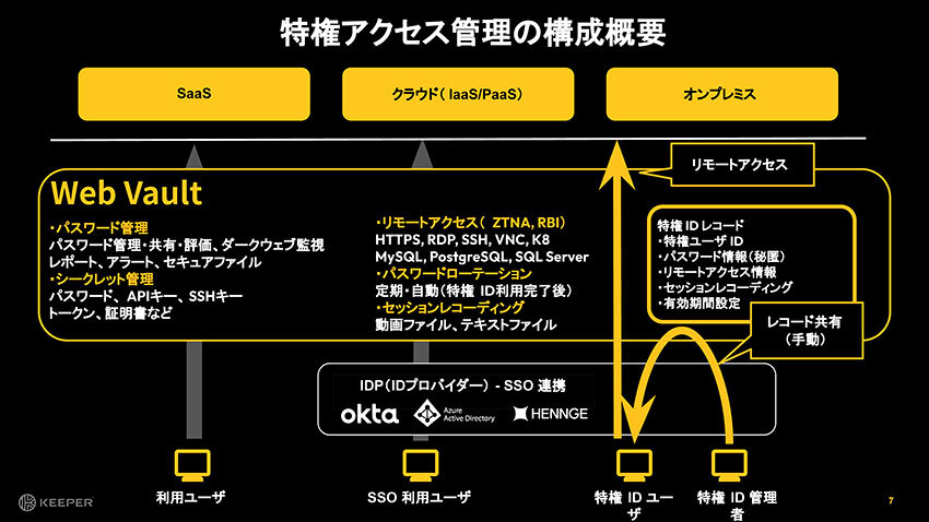 そのような事態を防ぐべく、KeeperPAMはゼロトラストをベースに特権IDを認証された正規の担当者だけが重要なインフラに安全にアクセスできるようにする。特権ID情報を安全なストレージに保存し、必要に応じて操作担当者に払い出す。また特権IDのパスワードはユーザーに公開しないように設定したり、定期的あるいは利用のたびに変更したりすることも可能だ。