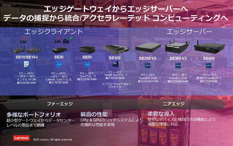 一方のニアエッジは、データセンターやクラウドなどのデジタルコアに近い場所でワークロードを実行するサーバー製品だ。必然的にファーエッジよりも強力なコンピューティングパワーが求められるため、レノボでは高度な処理性能と共に、過酷な環境下での運用にも耐えられる堅牢性を兼ね備えたエッジサーバーのラインナップを用意している。