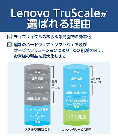さらにレノボはエッジハードウェアだけにとどまらない、広範なレノボ製品をサブスクリプション型で提供するサービスを提供している。それが「Lenovo TruScale」だ。従来の買い取りモデルと比べ、機器調達にかかる費用は使用した分だけで済むため、大きなコスト抑制効果が期待できる。そして何より、オンプレミスで稼働するシステムでありながら、レノボに運用管理を任せられるのがメリットだ。