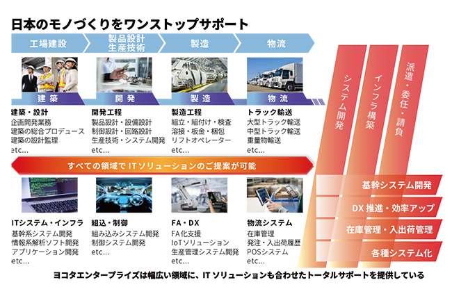 ヨコタエンタープライズは、2006年に一般貨物自動車運送業、2010年にアウトソーシング事業を立ち上げ、2020年にはシステム開発室を開設してITエンジニアリング事業に乗り出した。これら三つの事業を柱に「製造業をトータルにサポートする複合企業」として、サプライチェーンのあらゆる課題の解決を図っていく方針だ。グループ会社には一級建築士事務所を設け、製造業や物流業を幅広く支援することが可能な体制を確立した。