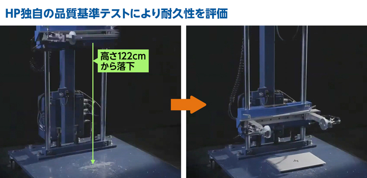 HPではPCの開発時に1モデルあたり12万時間に相当する品質テストを実施している。ボディーそのものや可動パーツの耐久性を検証・確認するもので、堅牢性を担保する裏付けとなっている。また、多くのビジネスPCが米軍調達基準(MIL-STD-810H)に準拠している。これは米軍が物資の調達に用いる規格で、これも厳密なテストをクリアすることが要求される。例を挙げると、122センチの高さから5センチの合板の上に合計26方向から落下させたり、最低で-29℃、最高で60℃になる気温でもきちんと動作するか確認したり、OSを稼働させたまま2時間揺さぶり続けるなど、実に過酷なものばかりだ。