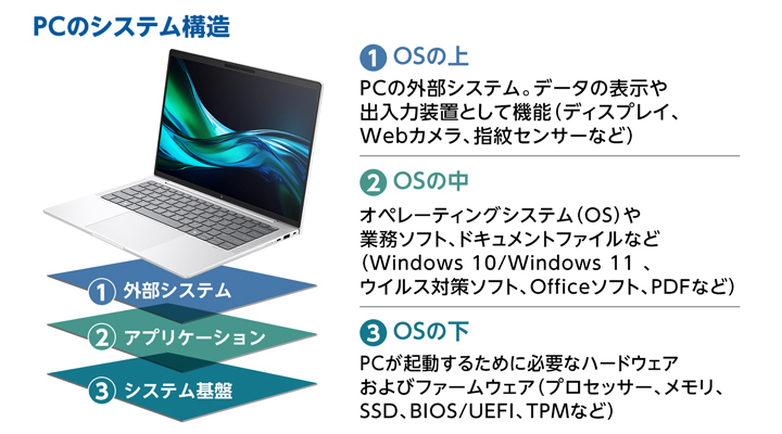 企業の機密を狙うサイバー攻撃は悪質化・巧妙化し、その被害の規模も拡大している。それゆえにPCのセキュリティ対策はビジネスを守る一丁目一番地と言える。HPのビジネスAI PCには「HP Wolf Security for Business」というソリューションが標準で組み込まれている。OSの上・中・下の領域で自律的にPCの安全性をチェックし、攻撃による侵害を検知すると自動で健全な状態に戻すセキュリティソリューションだ。