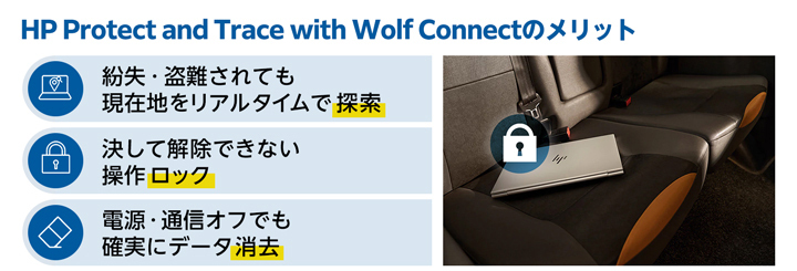 昨今、PCを持ち運ぶことは一般的になったが、それに伴いPC紛失や盗難のリスクも高まっている。ビジネス上の機密情報を収容したPCの行方がわからなくなったら、会社の信用にも関わる。だがこれは人間のうっかりミスが主要因。完全に防ぐことは困難だ。そんなリスクに有効なのが「HP Protect and Trace with Wolf Connect」*2というソリューション。PCがオフラインでも電源が入っていない状態でも、PCの現在地をリアルタイムで探索し、必要に応じてリモートでPCをロックしたり、NIST(米国国立標準技術研究所)が定めるレベルでデータ消去を実行するという革新的な機能だ。モバイルにおけるデバイス管理の信頼性を飛躍的に高め、万が一の際のコンプライアンスリスクにも対応できる。また、海外80か国以上にも対応しているため海外出張時などの盗難リスクにも対応が可能なのも大きな特長だ。(対応国情報はこちら)