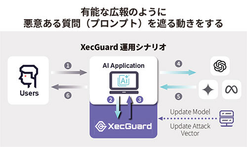 また、XecGuardの応答速度はミリ秒単位なので、AIアプリケーションの性能にも影響を与えない。あたかも記者会見における芸能人の広報担当者のように、悪意ある誘導質問が入力されたら即座に会話を遮り、AIアプリケーションを保護するのだ。