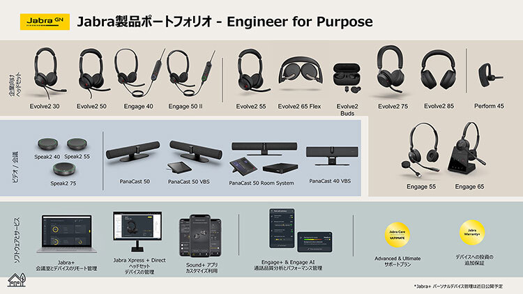 ヘッドセットやスピーカーフォン、会議室用ソリューションなどを広範にラインナップ
