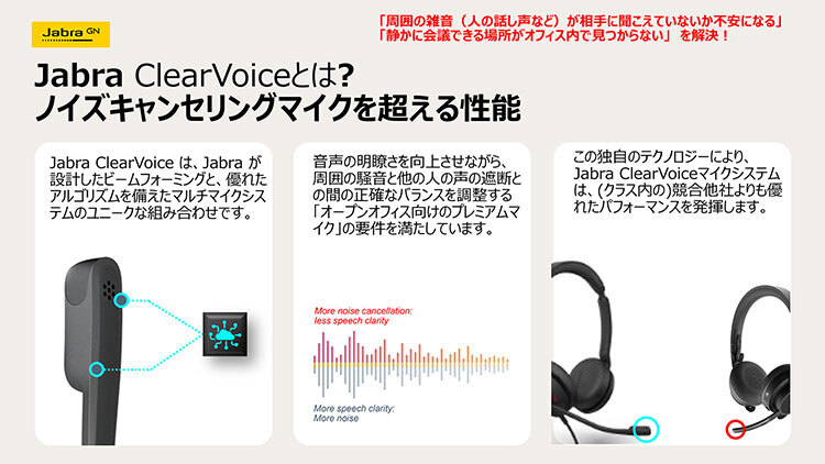オンライン会議のデバイスに求められる機能では、ノイズキャンセル機能が浮かぶ。一般的には聞く側(スピーカー)の快適さを支えるものだが、会議であればマイクのノイズキャンセル機能がより重要になる。先述したようなオンライン会議における音声の課題は「話者の声がクリアに伝わらない」ことに起因するためだ。Jabraブランドのヘッドセットには独自技術となる「ClearVoice」が実装されている。声の明瞭さに特化した音声処理技術として開発されたもので、複数のマイクとAIベースの音声処理により、周囲の雑音を除去して話者の声だけを明瞭に伝える。これにより、オープンオフィスや在宅など多様なワークプレイスにおいても、一定以上の音声品質を標準化できる。