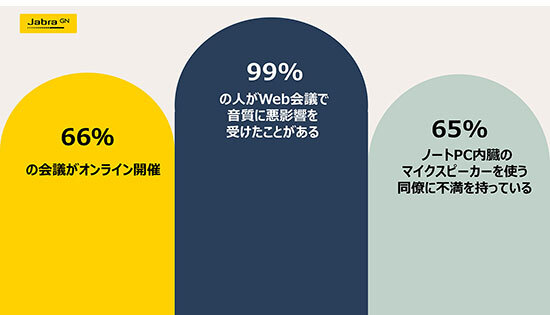 コロナ禍以降、オンライン会議が増えている。GNオーディオのグローバル調査によると、回答者の99%が「オンライン会議の音質に悪影響を受けたことがある」としており、「相手が使うノートPCの内蔵マイク、スピーカーに不満がある」との回答は65%に上った。誰しも、相手の声が聞こえづらいとか、環境音が混じり気まずい思いをしたなどの経験があるはずだ。こうした「聞き返し」や「聞き逃し」は、参加者個人のストレスだけでなく、会議時間の延長や意思決定の遅延など、組織全体の生産性低下にもつながる。