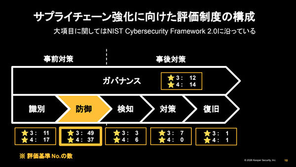 評価制度の構成はNISTサイバーセキュリティフレームワーク2.0に沿っており、ガバナンスや攻撃の検知、攻撃からの防御などの大項目も定められている。とくに“防御”の領域は★3で49項目、★4で37項目と、最も多くの評価基準が設定されており、この“防御”の領域でいかに対策を取っていくかが重要視されている。