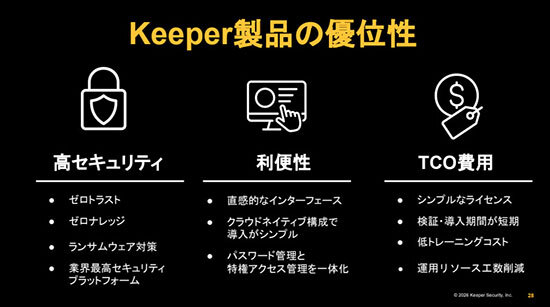 製品の優位性として中澤氏は「高セキュリティ、利便性、TCO削減の3点」を挙げる。セキュリティ面ではゼロトラスト、ゼロ知識アーキテクチャを採用し、業界最高位のFedRAMP認証のHighを取得している。このゼロ知識アーキテクチャの考えが非常に重要で今後主流になると考えている。このアーキテクチャは、ユーザー本人のみだけがデータを復号化することができ、本人以外は提供元のKeeper自身であっても暗号化された情報の中身を見ることは不可能だ。